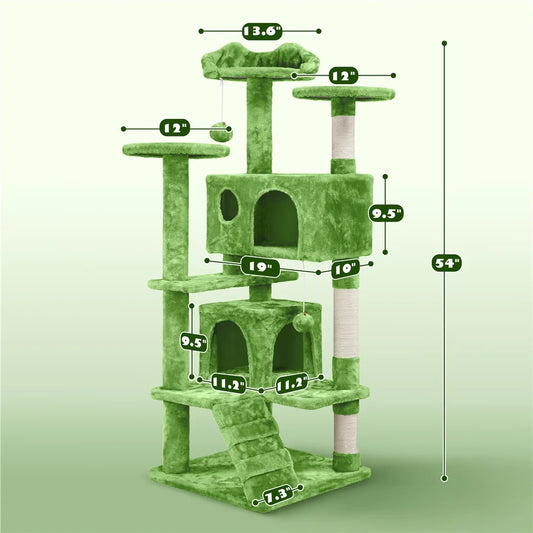 53.9" H Cat Tree with Double Condos, Scratching Posts & Ramp, Green