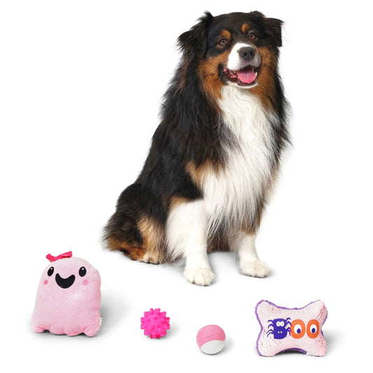 Halloween Dog Toys, 4 Piece Multipack, Pink Plush Ghost, Pink Squeaky Bone, Pink Tennis Ball, Pink Spiky Ball